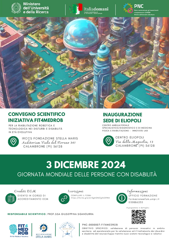 Il CONVEGNO SCIENTIFICO del 3 dicembre 2024 dell'IniziativaFit4MedRob per la riabilitazione robotica e tecnologica nei disturbi e disabilità in età evolutiva, organizzato dalla Fondazione Stella Maris, si articola nel seguente modo: